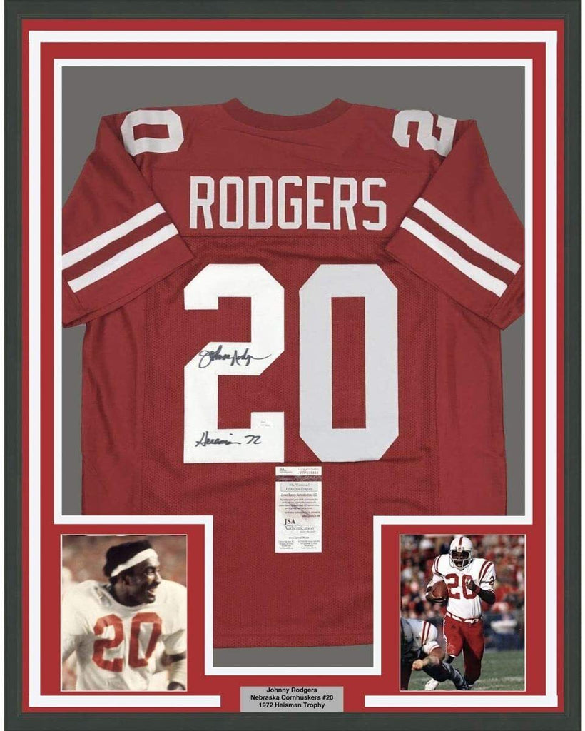 Framed Autographed/Signed Johnny Rodgers HT 72 33x42 Nebraska Red Jersey JSA COA