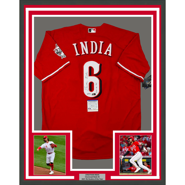 Framed Autographed/Signed Jonathan India 33x42 2021 NL ROY Red Jersey JSA COA