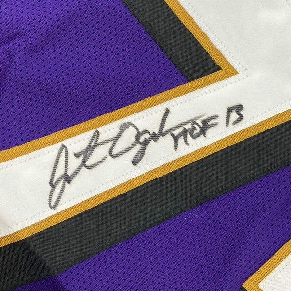 Framed Autographed/Signed Jonathan Ogden 33x42 HOF 13 Baltimore Purple Jersey The item is professionally framed & matted with two 8x10 photos, measures 33"x42" and is ready to be hung in your man cave! NOTE: COA card will be mounted on the back of the frame, not inside it on top of the jersey as seen in the picture.