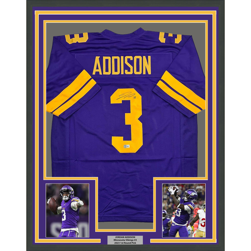 Framed Autographed/Signed Jordan Addison 35x39 Minnesota CR Jersey Beckett COA The item is professionally framed and matted with two 5x7 photos, measures 35x39 inches and is ready to be hung in your man cave! Photo and matting requests can be made.