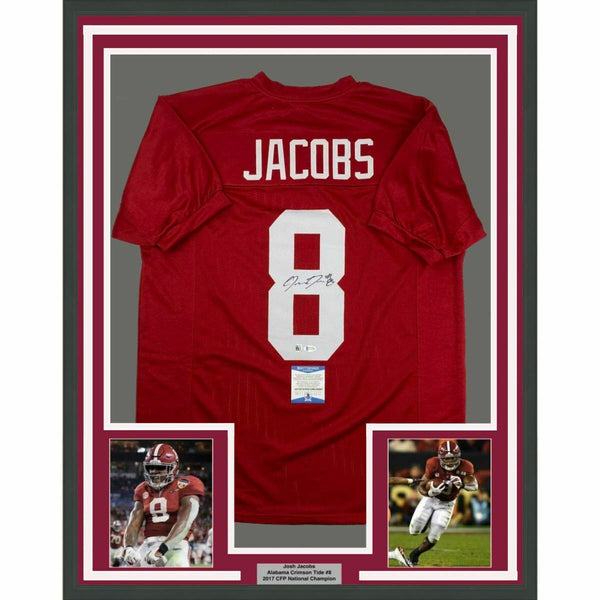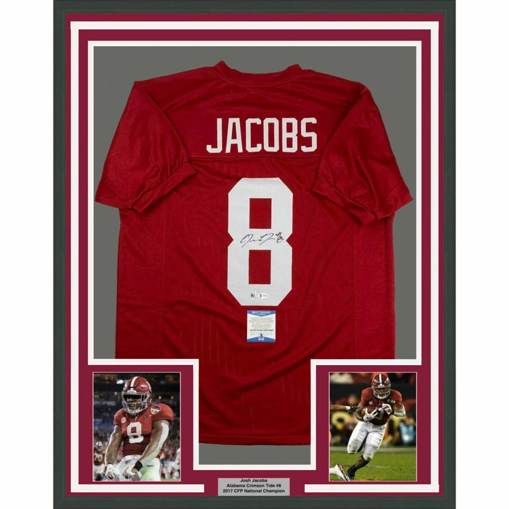 FRAMED Autographed/Signed JOSH JACOBS 33x42 Alabama Red College Jersey BAS COA The item is professionally framed & matted with two 8x10 photos, measures 33"x42" and is ready to be hung in your man cave! NOTE: COA card will be mounted on the back of the frame, not inside it on top of the jersey as seen in the picture. Please allow up to 5 business days for the item to be framed, packaged safely, and picked up by USPS. Photo and matting requests can be made.