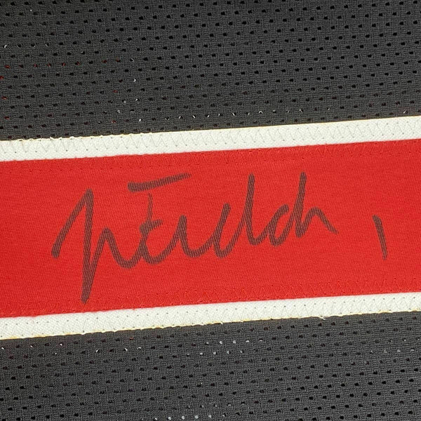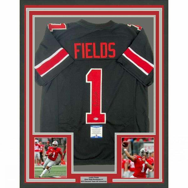 FRAMED Autographed/Signed JUSTIN FIELDS 33x42 Ohio State Black Jersey BAS COA The item is professionally framed & matted with two 8x10 photos, measures 33"x42" and is ready to be hung in your man cave! NOTE: COA card will be mounted on the back of the frame, not inside it on top of the jersey as seen in the picture.