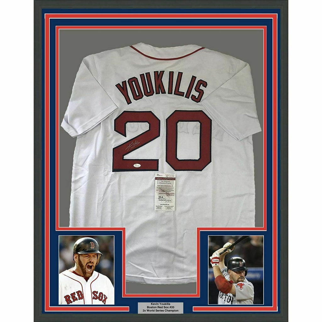 FRAMED Autographed/Signed KEVIN YOUKILIS 33x42 Boston White Jersey JSA COA Auto The item is professionally framed & matted with two 8x10 photos, measures 33"x42" and is ready to be hung in your man cave! NOTE: COA card will be mounted on the back of the frame, not inside it on top of the jersey as seen in the picture.