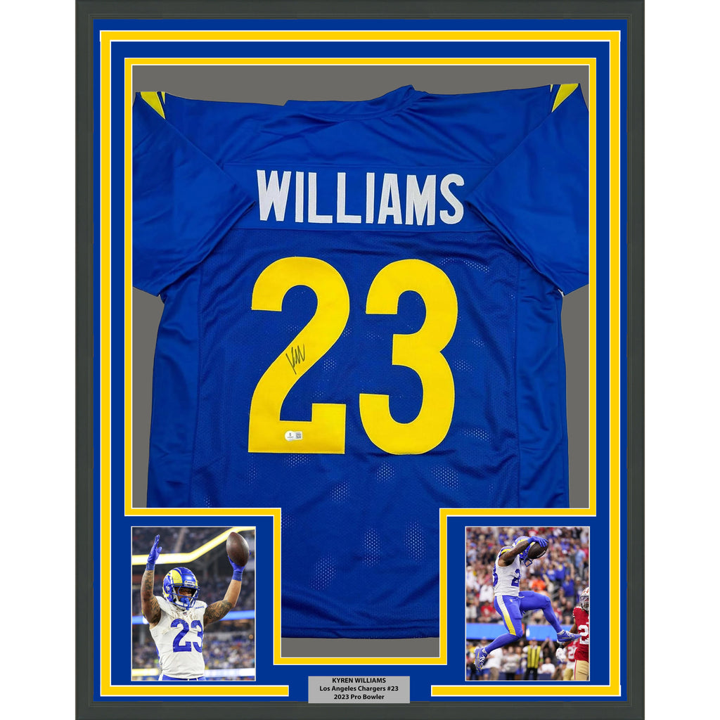 Framed Autographed/Signed Kyren Williams 35x39 LA Blue Jersey Beckett BAS COA #2 The item is professionally framed and matted with two 5x7 photos, measures 35x39 inches and is ready to be hung in your man cave! Photo and matting requests can be made.