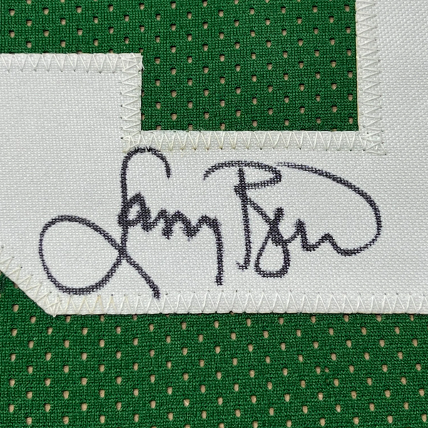 Framed Autographed/Signed Larry Bird 33x42 Boston Green Jersey PSA/DNA COA The item is professionally framed and matted with two 5x7 photos, measures 35x39 inches and is ready to be hung in your man cave! Photo and matting requests can be made.