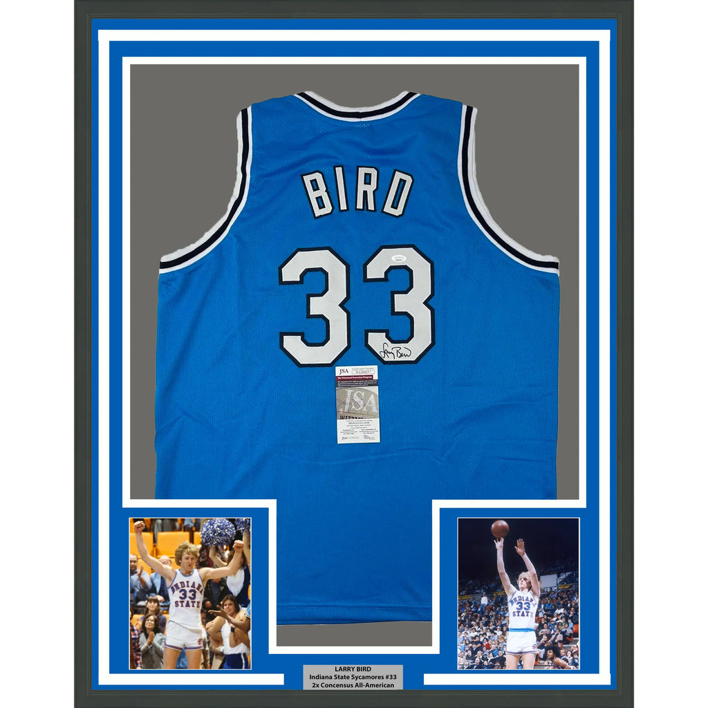 Framed Autographed/Signed Larry Bird 33x42 Indiana State Blue Jersey JSA COA The item is professionally framed and matted with two 5x7 photos, measures 35 inches by 39 inches and is ready to be hung in your man cave! Photo and matting requests can be made.