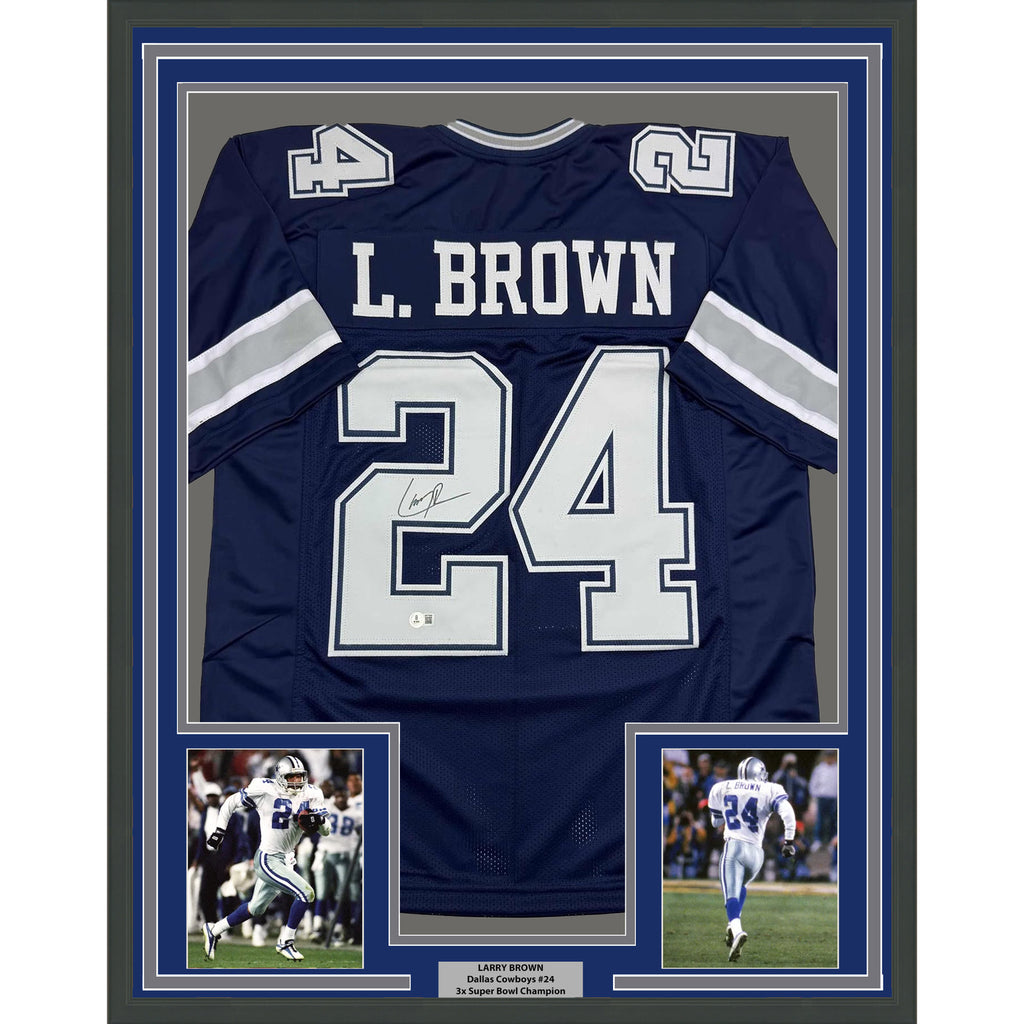 Framed Autographed/Signed Larry Brown 35x39 Dallas Blue Football Jersey BAS COA The item is professionally framed and matted with two 5x7 photos, measures 35x39 inches and is ready to be hung in your man cave! Photo and matting requests can be made.