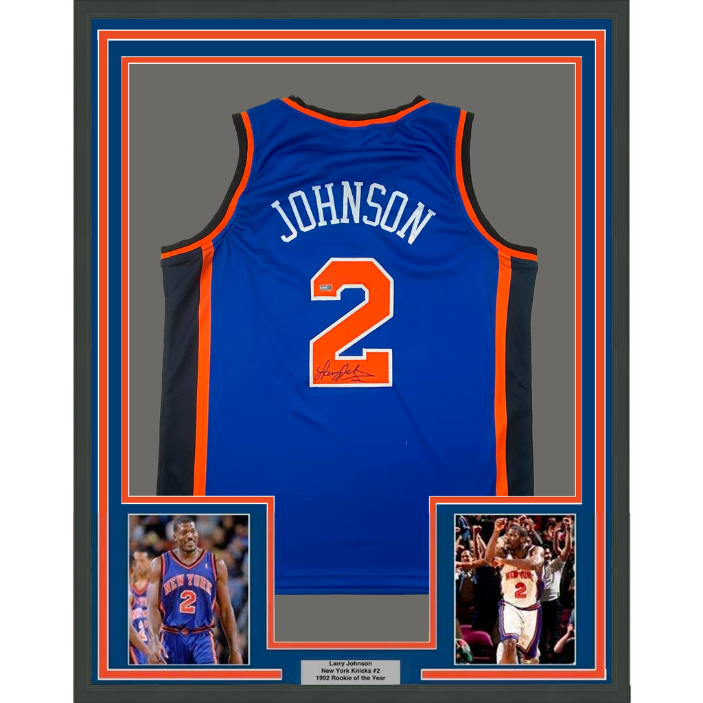 Framed Autographed/Signed Larry Johnson 33x42 New York Blue Jersey Steiner COA