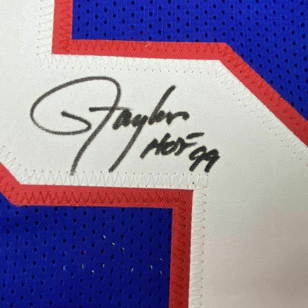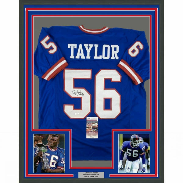 FRAMED Autographed/Signed LAWRENCE TAYLOR HOF 33x42 New York Blue Jersey JSA COA The item is professionally framed & matted with two 8x10 photos, measures 33"x42" and is ready to be hung in your man cave! NOTE: COA card will be mounted on the back of the frame, not inside it on top of the jersey as seen in the picture. Please allow up to 5 business days for the item to be framed, packaged safely, and picked up by UPS. Photo and matting requests can be made.