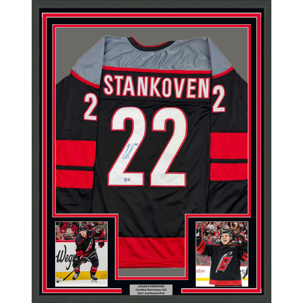 Framed Autographed/Signed Logan Stankoven 35x39 Carolina Black Jersey BAS COA The item is professionally framed and matted with two 5x7 photos, measures 35x39 inches and is ready to be hung in your man cave! Photo and matting requests can be made.