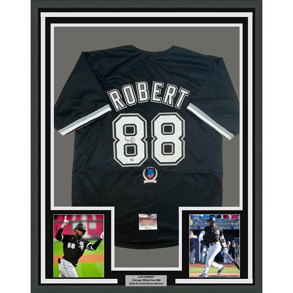 Framed Autographed/Signed Luis Robert 33x42 Chicago Black Jersey Beckett BAS COA The item is professionally framed & matted with two 8x10 photos, measures 33"x42" and is ready to be hung in your man cave! NOTE: COA card will be mounted on the back of the frame, not inside it on top of the jersey as seen in the picture.