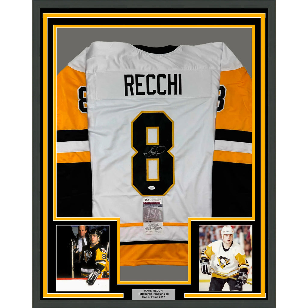 Framed Autographed/Signed Mark Recchi 33x42 Pittsburgh White Jersey JSA COA The item is professionally framed and matted with two 5x7 photos, measures 35 inches by 39 inches and is ready to be hung in your man cave! Photo and matting requests can be made.