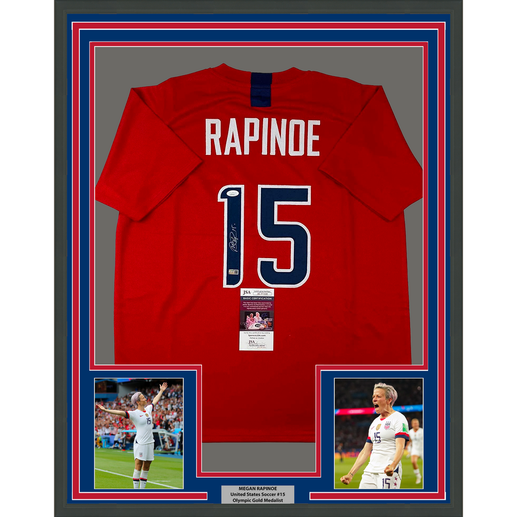 Framed Autographed/Signed Megan Rapinoe 33x42 Red Soccer Team USA Jersey JSA COA The item is professionally framed & matted with two 5x7 photos, measures 33"x42" and is ready to be hung in your man cave! NOTE: COA card will be mounted on the back of the frame, not inside it on top of the jersey as seen in the picture.