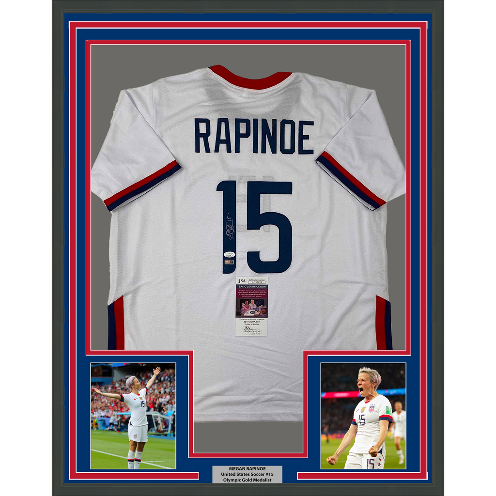 Framed Autographed/Signed Megan Rapinoe 33x42 White Team USA Jersey JSA COA The item is professionally framed & matted with two 5x7 photos, measures 33"x42" and is ready to be hung in your man cave! NOTE: COA card will be mounted on the back of the frame, not inside it on top of the jersey as seen in the picture.