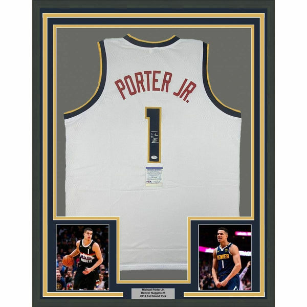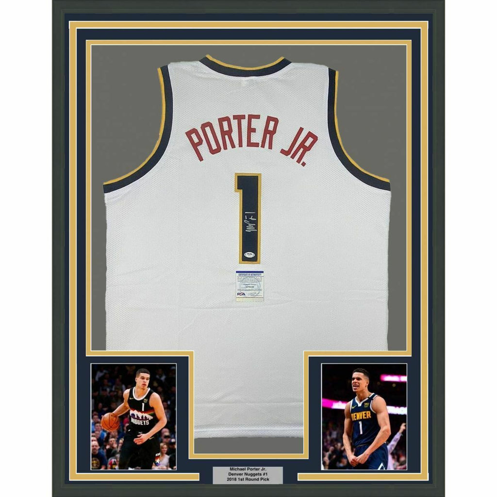 FRAMED Autographed/Signed MICHAEL PORTER JR 33x42 White Jersey PSA/DNA COA The item is professionally framed & matted with two 8x10 photos, measures 33"x42" and is ready to be hung in your man cave! NOTE: COA card will be mounted on the back of the frame, not inside it on top of the jersey as seen in the picture.