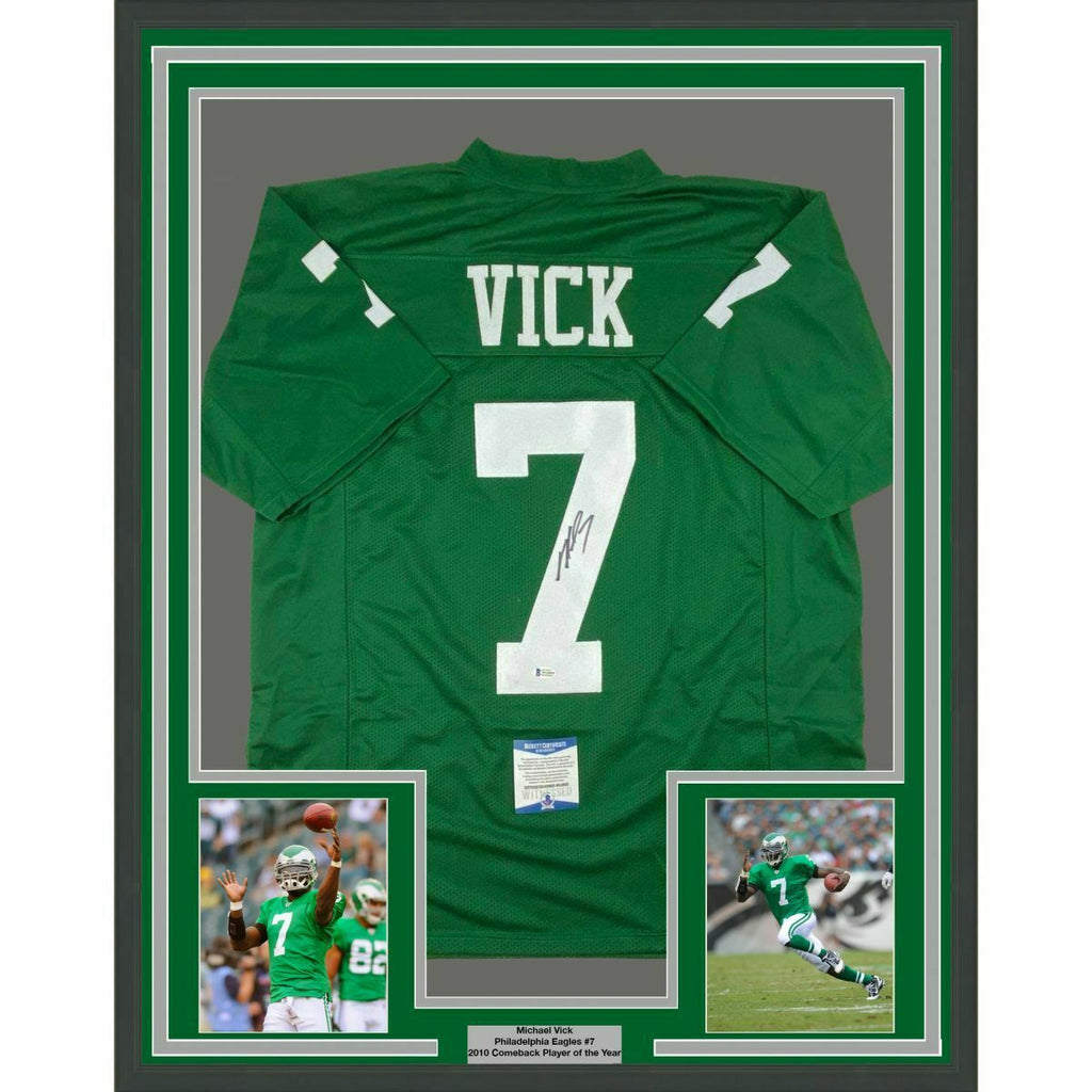 FRAMED Autographed/Signed MICHAEL VICK 33x42 Philadelphia Kelly Jersey BAS COA The item is professionally framed & matted with two 8x10 photos, measures 33"x42" and is ready to be hung in your man cave! NOTE: COA card will be mounted on the back of the frame, not inside it on top of the jersey as seen in the picture.