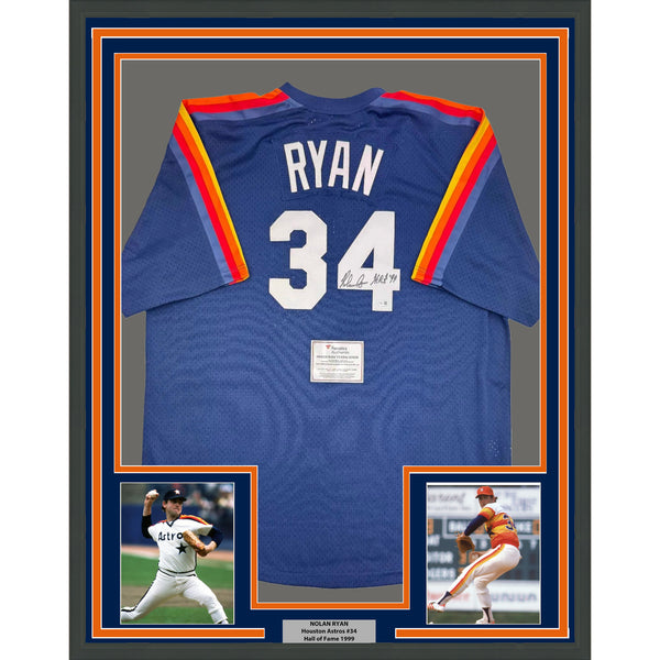 Framed Autographed/Signed Nolan Ryan 35x39 "HOF 99" Blue Jersey Fanatics COA The item is professionally framed and matted with two 5x7 photos, measures 35x39 inches and is ready to be hung in your man cave! Photo and matting requests can be made.