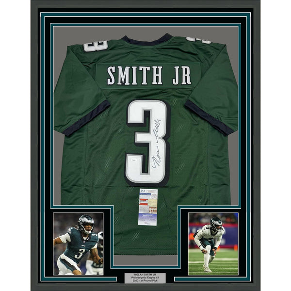 Framed Autographed/Signed Nolan Smith Jr. 35x39 Green Football Jersey JSA COA The item is professionally framed and matted with two 5x7 photos, measures 35x39 inches and is ready to be hung in your man cave! Photo and matting requests can be made.