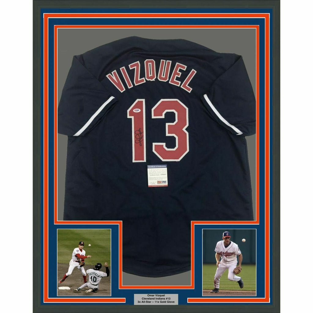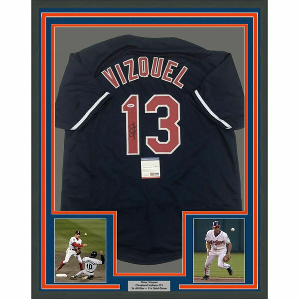 FRAMED Autographed/Signed OMAR VIZQUEL 33x42 Cleveland Blue Jersey PSA/DNA COA The item is professionally framed & matted with two 8x10 photos, measures 33"x42" and is ready to be hung in your man cave! NOTE: COA card will be mounted on the back of the frame, not inside it on top of the jersey as seen in the picture.