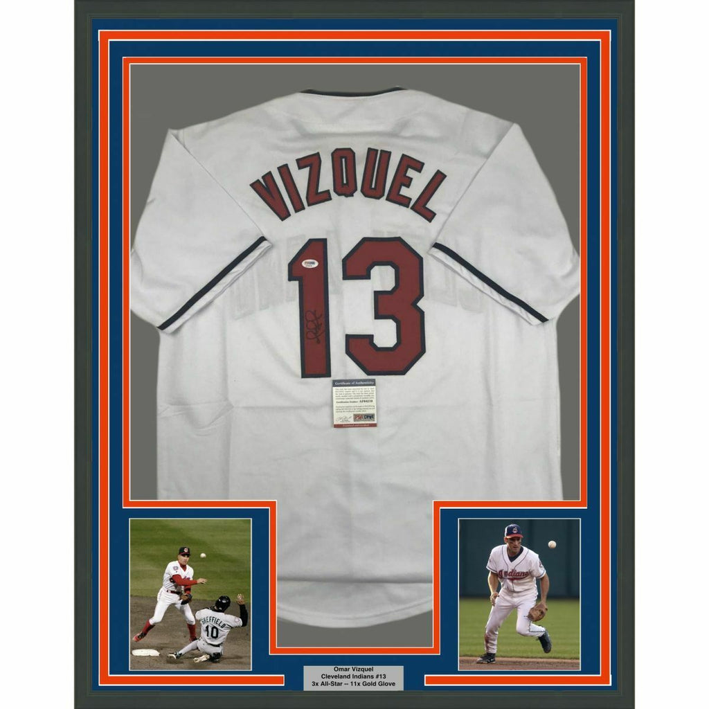 FRAMED Autographed/Signed OMAR VIZQUEL 33x42 Cleveland White Jersey PSA/DNA COA The item is professionally framed & matted with two 8x10 photos, measures 33"x42" and is ready to be hung in your man cave! NOTE: COA card will be mounted on the back of the frame, not inside it on top of the jersey as seen in the picture.