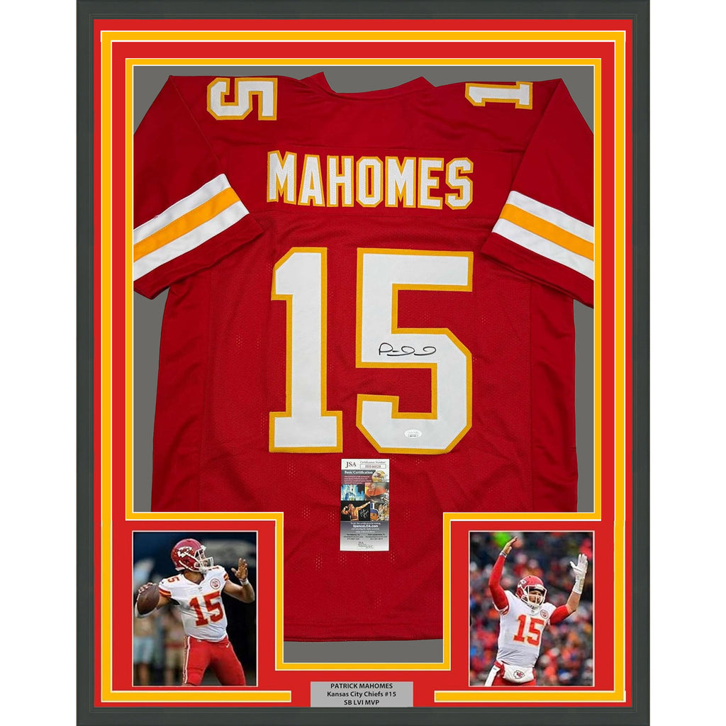 Framed Autographed/Signed Patrick Mahomes 35x39 Kansas City Red Jersey JSA COA The item is professionally framed and matted with two 5x7 photos, measures 35x39 inches and is ready to be hung in your man cave! Photo and matting requests can be made.