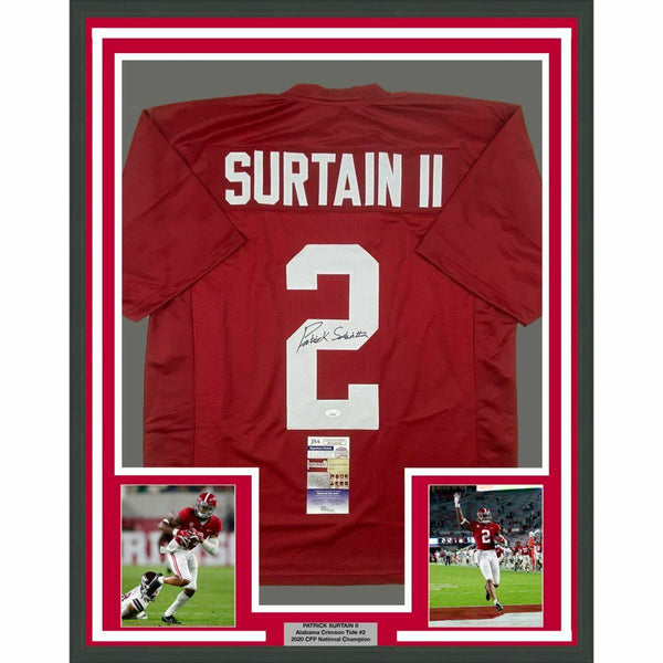 FRAMED Autographed/Signed PATRICK SURTAIN II 33x42 Alabama Red Jersey JSA COA The item is professionally framed & matted with two 8x10 photos, measures 33"x42" and is ready to be hung in your man cave! NOTE: COA card will be mounted on the back of the frame, not inside it on top of the jersey as seen in the picture.