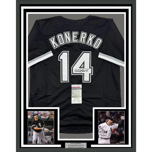 Framed Autographed/Signed Paul Konerko 35x39 Chicago Black Jersey JSA COA The item is professionally framed and matted with two 5x7 photos, measures 35x39 inches and is ready to be hung in your man cave! Photo and matting requests can be made.