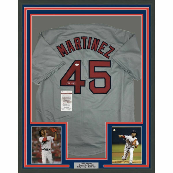 FRAMED Autographed/Signed PEDRO MARTINEZ 33x42 Boston Grey Jersey JSA COA Auto The item is professionally framed & matted with two 8x10 photos, measures 33"x42" and is ready to be hung in your man cave! NOTE: COA card will be mounted on the back of the frame, not inside it on top of the jersey as seen in the picture. Please allow up to 5 business days for the item to be framed, packaged safely, and picked up by UPS. Photo and matting requests can be made.