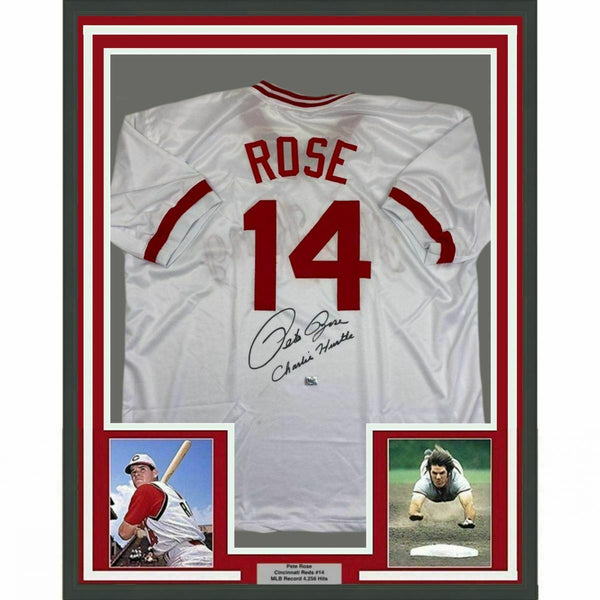 FRAMED Autographed/Signed PETE ROSE Charlie Hustle 33x42 White Jersey Holo COA 1 The item is professionally framed & matted with two 8x10 photos, measures 33"x42" and is ready to be hung in your man cave! NOTE: COA card will be mounted on the back of the frame, not inside it on top of the jersey as seen in the picture. Please allow up to 5 business days for the item to be framed, packaged safely, and picked up by USPS. Photo and matting requests can be made.