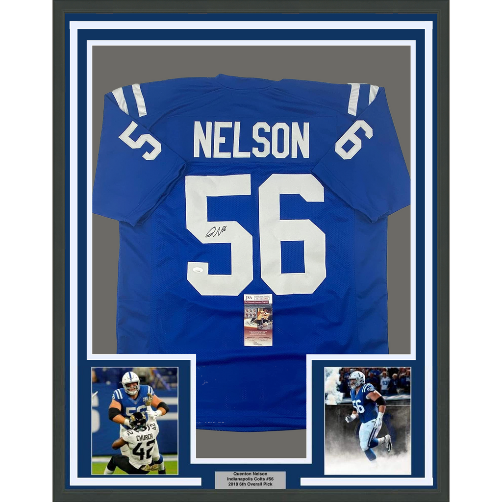 Framed Autographed/Signed Quenton Nelson 33x42 Indianapolis Blue Jersey JSA COA The item is professionally framed & matted with two 8x10 photos, measures 33"x42" and is ready to be hung in your man cave! NOTE: COA card will be mounted on the back of the frame, not inside it on top of the jersey as seen in the picture.