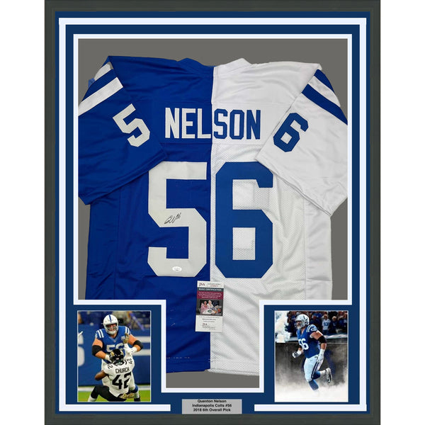 Framed Autographed/Signed Quenton Nelson 35x39 Indianapolis Split Jersey JSA COA The item is professionally framed and matted with two 5x7 photos, measures 35x39 inches and is ready to be hung in your man cave! Photo and matting requests can be made.