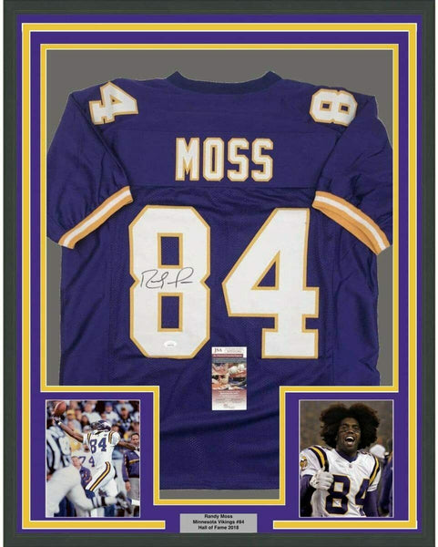 Framed Autographed/Signed Randy Moss 33x42 Minnesota Purple Jersey JSA COA The item is professionally framed & matted with two 8x10 photos, measures 33"x42" and is ready to be hung in your man cave! NOTE: COA card will be mounted on the back of the frame, not inside it on top of the jersey as seen in the picture.