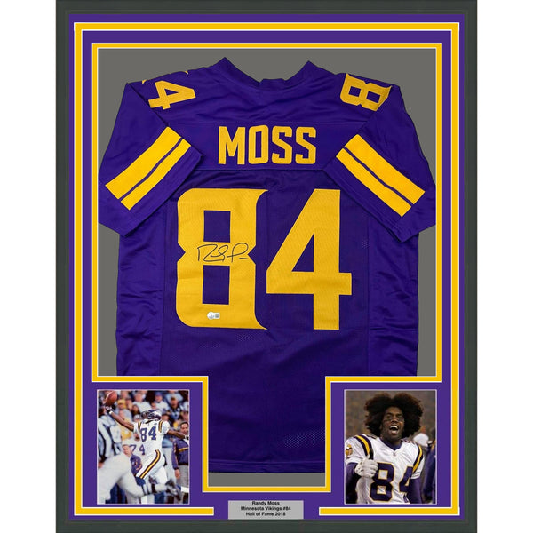 Framed Autographed/Signed Randy Moss 35x39 Minnesota Color Rush Jersey BAS COA The item is professionally framed and matted with two 5x7 photos, measures 35x39 inches and is ready to be hung in your man cave! Photo and matting requests can be made.