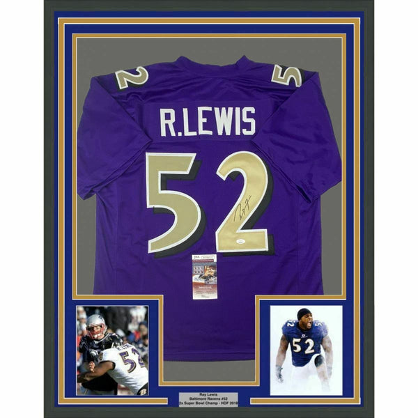 FRAMED Autographed/Signed RAY LEWIS 33x42 Color Rush Football Jersey JSA COA The item is professionally framed & matted with two 8x10 photos, measures 33"x42" and is ready to be hung in your man cave! NOTE: COA card will be mounted on the back of the frame, not inside it on top of the jersey as seen in the picture.