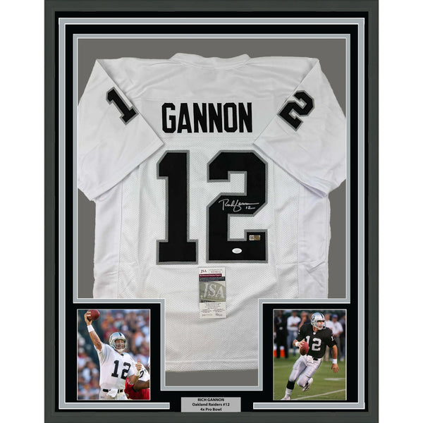 Framed Autographed/Signed Rich Gannon 33x42 Oakland LV White Jersey JSA COA The item is professionally framed and matted with two 5x7 photos, measures 35 inches by 39 inches and is ready to be hung in your man cave! Photo and matting requests can be made.