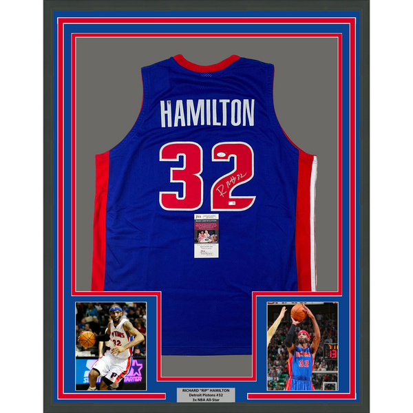 Framed Autographed/Signed Richard Rip Hamilton 33x42 Detroit Blue Jersey JSA COA The item is professionally framed & matted with two 5x7 photos, measures 33"x42" and is ready to be hung in your man cave! NOTE: COA card will be mounted on the back of the frame, not inside it on top of the jersey as seen in the picture.