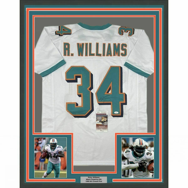 FRAMED Autographed/Signed RICKY WILLIAMS 33x42 Miami White Jersey JSA COA Auto The item is professionally framed & matted with two 8x10 photos, measures 33"x42" and is ready to be hung in your man cave! NOTE: COA card will be mounted on the back of the frame, not inside it on top of the jersey as seen in the picture.