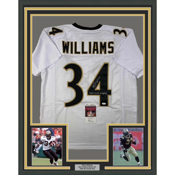 Framed Autographed/Signed Ricky Williams 33x42 White Football Jersey JSA COA The item is professionally framed and matted with two 5x7 photos, measures 35 inches by 39 inches and is ready to be hung in your man cave! Photo and matting requests can be made.