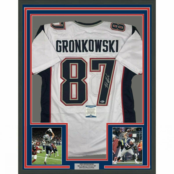 FRAMED Autographed/Signed ROB GRONKOWSKI 33x42 New England White Jersey BAS COA The item is professionally framed & matted with two 8x10 photos, measures 33"x42" and is ready to be hung in your man cave! NOTE: COA card will be mounted on the back of the frame, not inside it on top of the jersey as seen in the picture.