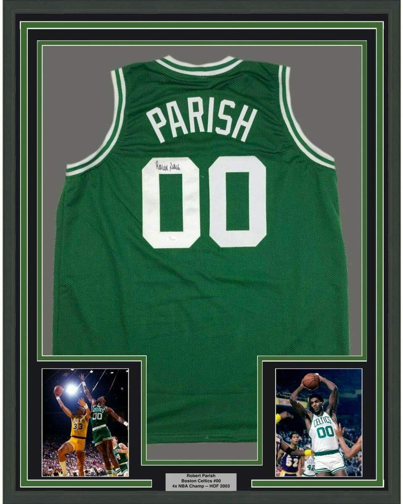 Framed Autographed/Signed Robert Parish 33x42 Boston Green Jersey JSA COA The item is professionally framed & matted with two 8x10 photos, measures 33"x42" and is ready to be hung in your man cave! NOTE: COA card will be mounted on the back of the frame, not inside it on top of the jersey as seen in the picture.