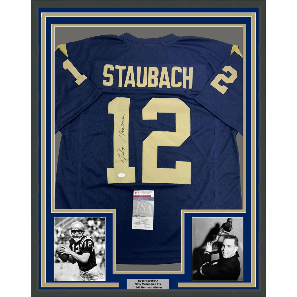 Framed Autographed/Signed Roger Staubach 35x39 Navy Blue College Jersey JSA COA The item is professionally framed and matted with two 5x7 photos, measures 35x39 inches and is ready to be hung in your man cave! Photo and matting requests can be made.