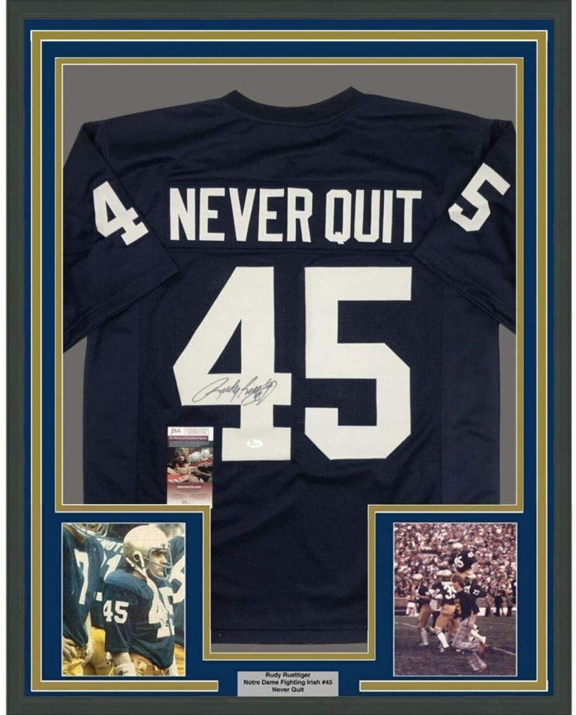 Framed Autographed/Signed Rudy Ruettiger 35x39 Never Quit ND Blue Jersey JSA COA The item is professionally framed and matted with two 5x7 photos, measures 35 inches by 39 inches and is ready to be hung in your man cave! Photo and matting requests can be made.
