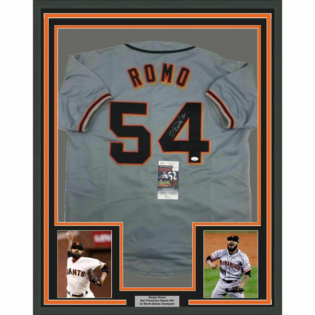 FRAMED Autographed/Signed SERGIO ROMO 33x42 San Francisco Grey Jersey JSA COA The item is professionally framed & matted with two 8x10 photos, measures 33"x42" and is ready to be hung in your man cave! NOTE: COA card will be mounted on the back of the frame, not inside it on top of the jersey as seen in the picture. Please allow up to 5 business days for the item to be framed, packaged safely, and picked up by USPS. Photo and matting requests can be made.