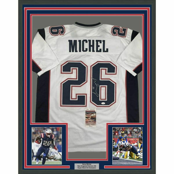 FRAMED Autographed/Signed SONY MICHEL 33x42 New England White Jersey JSA COA The item is professionally framed & matted with two 8x10 photos, measures 33"x42" and is ready to be hung in your man cave! NOTE: COA card will be mounted on the back of the frame, not inside it on top of the jersey as seen in the picture. Please allow up to 5 business days for the item to be framed, packaged safely, and picked up by USPS. Photo and matting requests can be made.