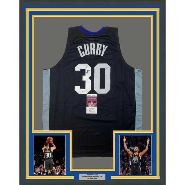 Framed Autographed/Signed Stephen Steph Curry 33x42 Black Jersey JSA COA The item is professionally framed and matted with two 5x7 photos, measures 35x39 inches and is ready to be hung in your man cave! Photo and matting requests can be made.