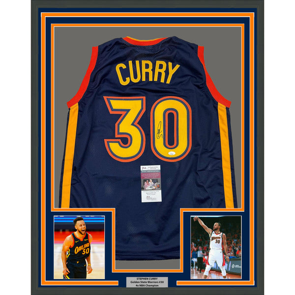 Framed Autographed/Signed Stephen Steph Curry 35x39 Navy Retro Jersey JSA COA The item is professionally framed and matted with two 5x7 photos, measures 35x39 inches and is ready to be hung in your man cave! Photo and matting requests can be made.