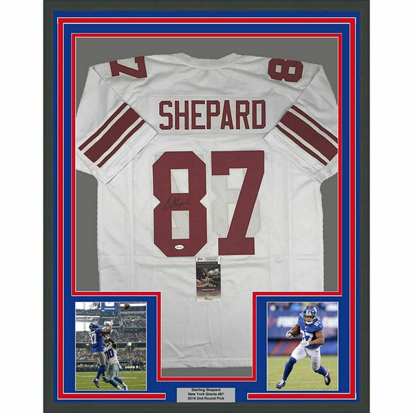 FRAMED Autographed/Signed STERLING SHEPARD 33x42 New York White Jersey JSA COA The item is professionally framed & matted with two 8x10 photos, measures 33"x42" and is ready to be hung in your man cave! NOTE: COA card will be mounted on the back of the frame, not inside it on top of the jersey as seen in the picture.