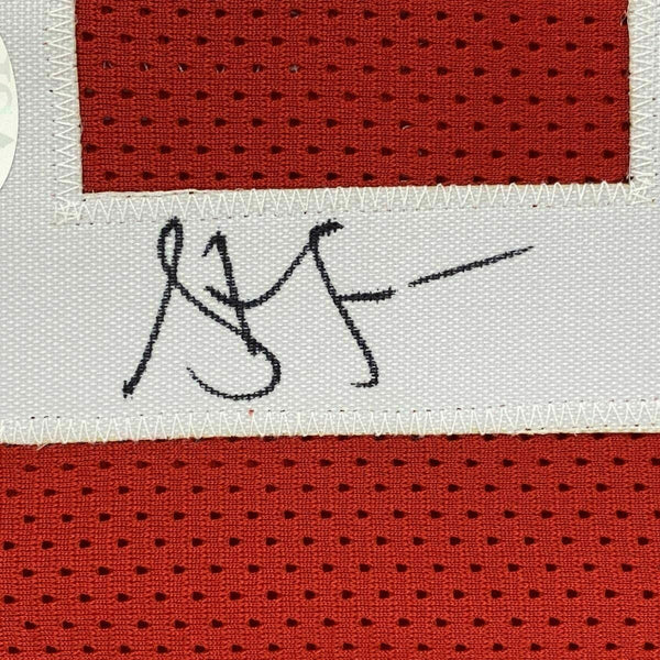 FRAMED Autographed/Signed STEVE FRANCIS 33x42 Houston Red Jersey JSA COA Auto The item is professionally framed & matted with two 8x10 photos, measures 33"x42" and is ready to be hung in your man cave! NOTE: COA card will be mounted on the back of the frame, not inside it on top of the jersey as seen in the picture.