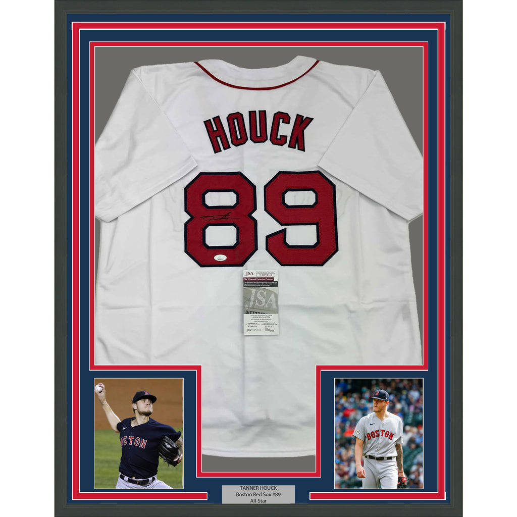 Framed Autographed/Signed Tanner Houck 35x39 Boston White Jersey JSA COA The item is professionally framed and matted with two 5x7 photos, measures 35x39 inches and is ready to be hung in your man cave! Photo and matting requests can be made.