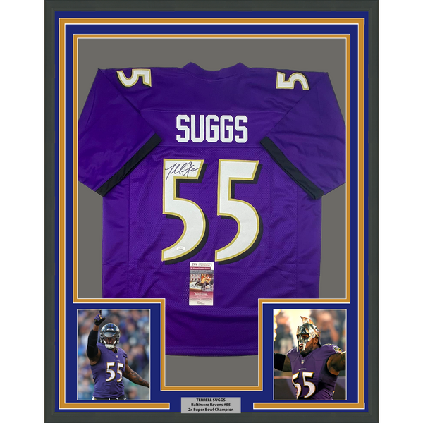 Framed Autographed/Signed Terrell Suggs 33x42 Baltimore Purple Jersey JSA COA The item is professionally framed & matted with two 8x10 photos, measures 33"x42" and is ready to be hung in your man cave! NOTE: COA card will be mounted on the back of the frame, not inside it on top of the jersey as seen in the picture.